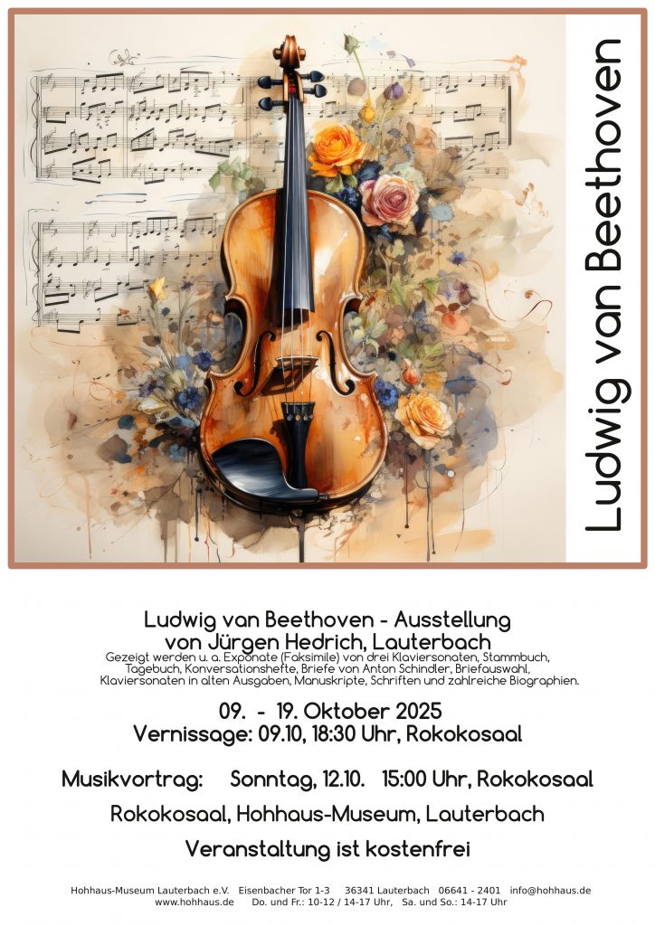 Jürgen Hedrich aus Lauterbach führt sie ein in die Biografie Ludwig van Beethovens. Im Jahr 2027 begehen wir den 200. Todestag dieses Ausnahmekünstlers. Herr Hedrich zieht nun dieses Datum vor, da für das Hohhaus mittelfristig größere Umbaumaßnahmen vorgesehen sind. Herr Hedrich ist leidenschaftlicher und musikbegeisterter Forscher im Bereich der Klassik. Von ihm stammen auch alle vorgestellten Exponate in den Galerieräumen das Hohhauses. Tauchen sie mit uns gemeinsam ein in die Welt Ludwig van Beethovens.